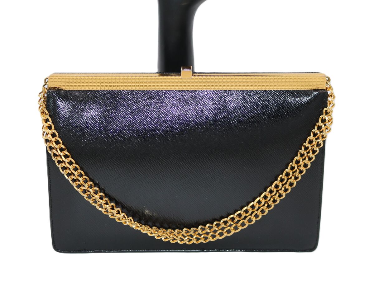 Vintage Koret small black East India goatskin leather clutch handbag . It has a gold-toned trim and chain style handle. The inside is lined in a black and gold-toned satin material with one slide pocket and zippered pocket. It comes with a coin purse that is attached by a small delicate chain. The Koret logo is embossed on the inside panel and on the coin purse. This bag is in excellent vintage condition. It is approx 8 1/4L x 6H x 2W and the handle has an approx 5 1/2 inch drop.