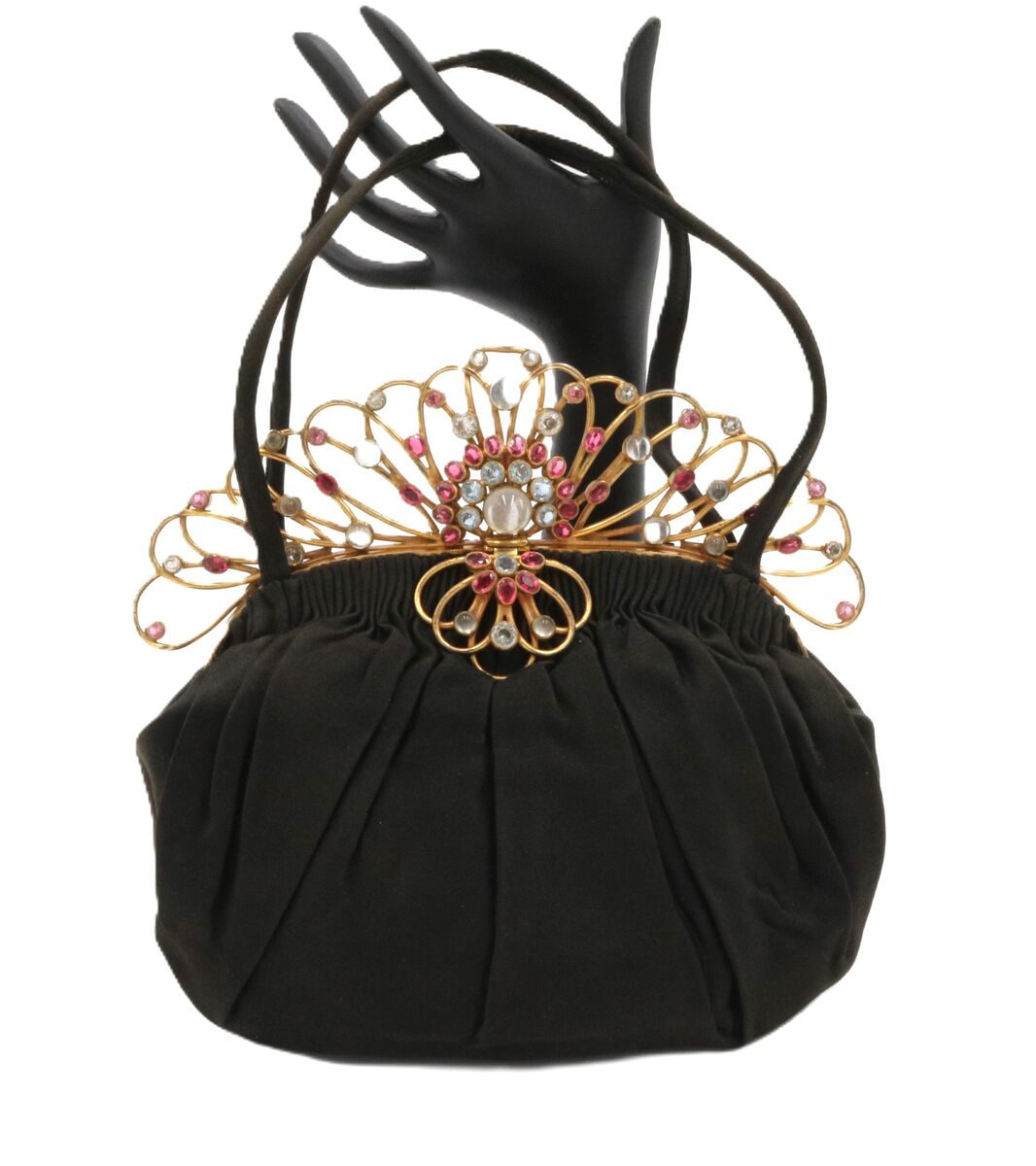 Vintage Redisch Bags black satin Hobe' jewel set frame double handle handbag. It is lined in a satin material. It has pockets on both sides. It has the Hobe' multi-color jewels embedded in a gold toned frame in a tiara shape with large loops. There are bezel set crystal rhinestones in clear and pink tones. There are also large and medium round dome top stones that look similar to moon stones. There are also stones on each side of the bag where the frame hinge opens. The gold toned hardware has some oxidation as expected with a vintage bag. These frames were rarely signed. The handles do have some thread wear. (see pics) This bag is in very good to excellent vintage condition. It is approx 8L x 6H x 3W. The handles have an approx 5 1/2 inch drop.