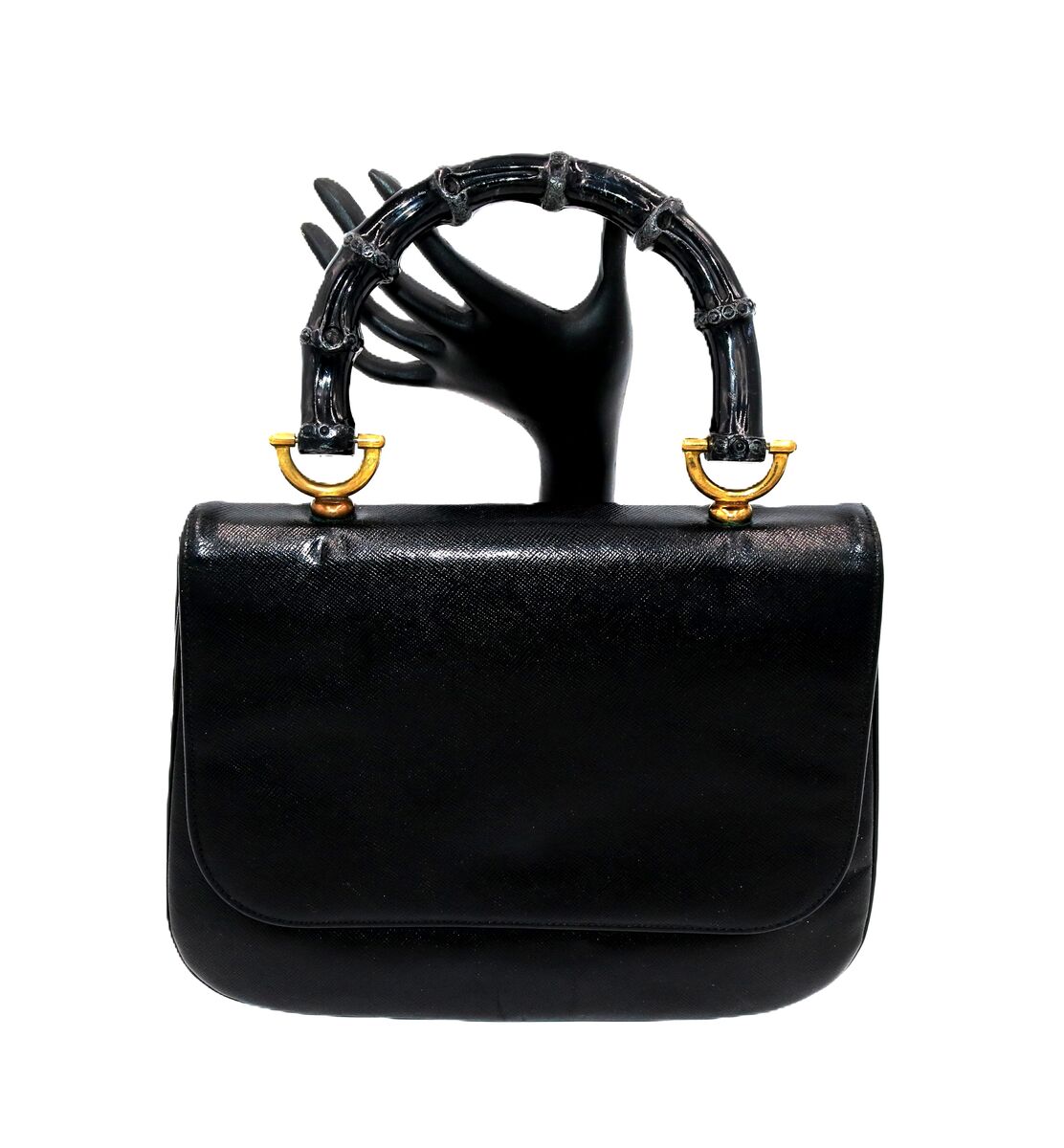 Vintage Greta black leather dome handle handbag. Mid century. It has a plastic/resin dome handle that does show some wear. The inside is lined with a black material. It has two main compartments and several pockets. The signature Greta logo is embossed on the leather flap. It has some impressions on the outside from the handle and from storage. It is in very good to excellent vintage condition. It is 9 1/2L x 7 1/2H x 2W. It has an approx 4 1/2 inch strap drop.